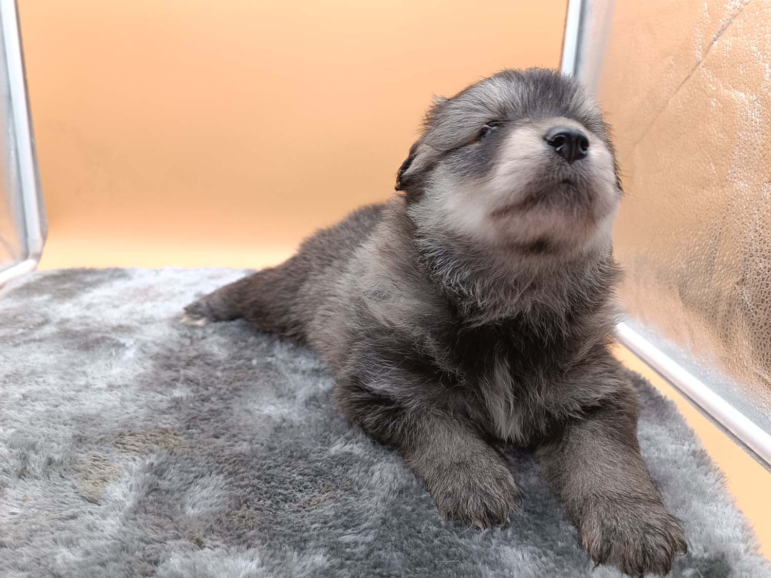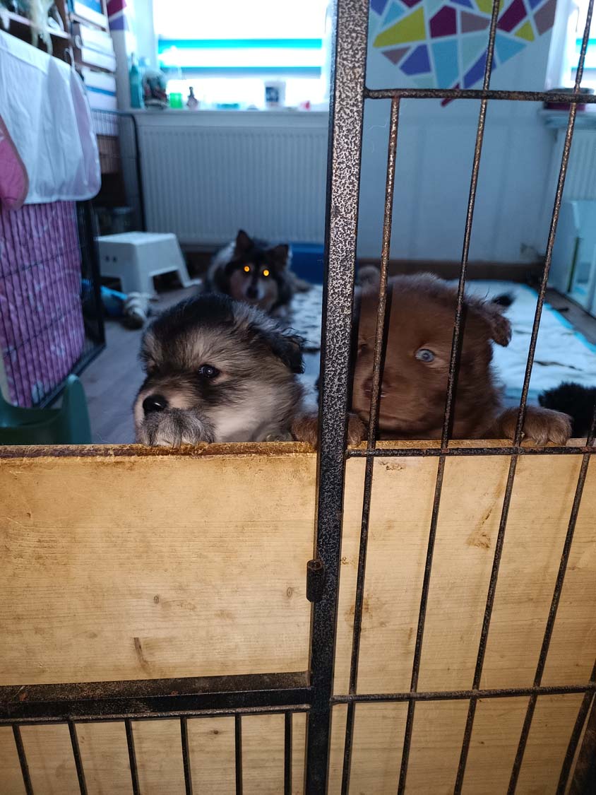 Noch ein kurzes Update bevor der neue Monat anfängt. Diese Woche war aufregend, zumindest für 2 der Zwerge. Letzten Sonntag hatte Hubble ein zugeklebtes Auge, passiert bei den Welpen hin und wieder mal, etwas warmes Wasser, vorsichtig reiben und er konnte wieder was sehen. Am Montag war das Auge wieder zugeklebt, sicherheitshalber bei der Tierärztin angerufen, sie meinte mal noch einen Tag warten und säubern, das war früh, am späten Nachmittag, waren dann beide Augen zu, also wieder Tierärztin angerufen und Termin für den nächsten früh bekommen. Wenn ich zur Tierärztin mit einen Welpen muss, nehme ich in der Regel einen zweiten zum Vergleichen mit - Hubbles Partner war Helix. Die beiden haben die erste Autofahrt (circa 20min je Strecke) souverän gemeistert. Bei der Tierärztin stellte sich dann bei Hubble eine leichte Bindehautentzündung heraus. Im Video sieht man ja manchmal wie Hexe die Welpe säubert und die Tierärztin vermutet, dass Hexe dabei etwas in seine Augen gerieben hat. Es gab darauf hin für Hubble Augentropfen und bereits zwei Tage später war alles wieder normal, ich hab dann wie verordnet die Augentropfen noch drei Tage weiter gegeben.
