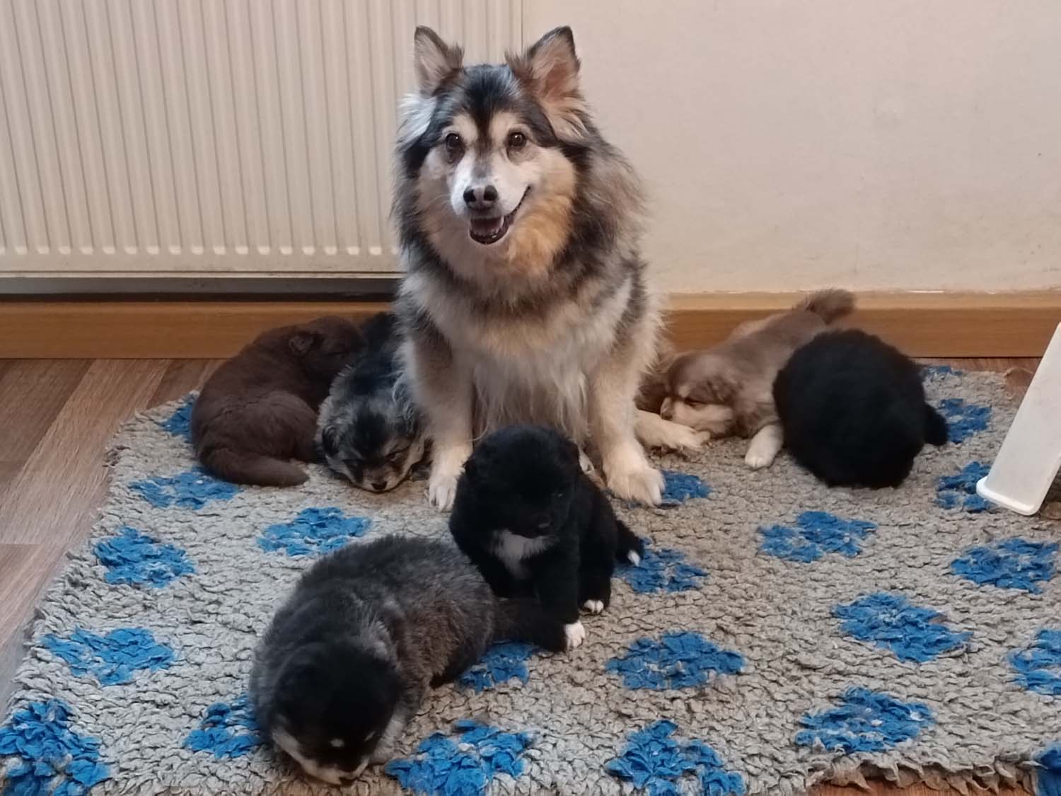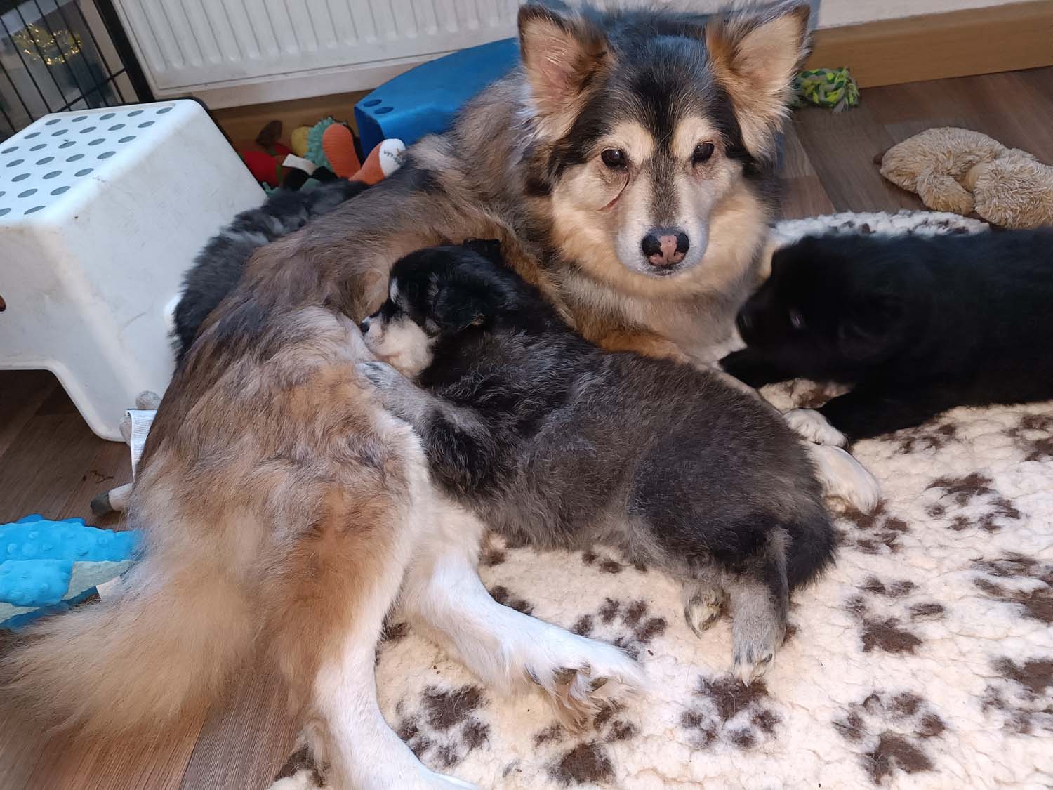 Hexi hat gestern in den frühen Morgenstunden 6 Welpen das Leben geschenkt. Die Welpen kamen zwischen kurz vor 4 und 6.30 im sehr zügigem Abstand zur Welt. Hexe hat eine super Arbeit gemacht und ich musste nur 1 mal kurz eingreifen um eine Fruchthülle zu öffnen. Ansonsten hat sie die Geburt absolut selbstständig über die Bühne gebracht.