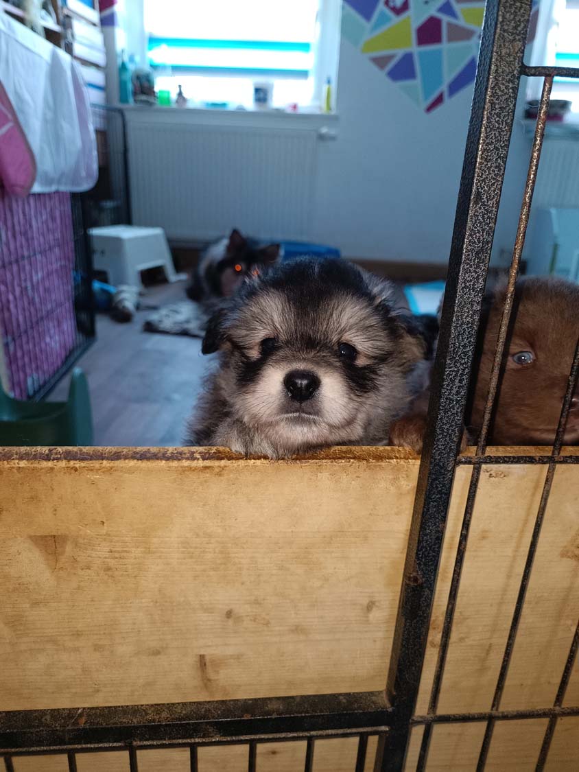 Ich bin gefragt worden warum ich die Welpen immer von außerhalb filme, denke nicht, dass jemand Interesse hat für 10min meine Füße und Bein zu betrachten ;). Die Welpen suchen nun immer mehr auch aktiv den Kontakt zu mir.